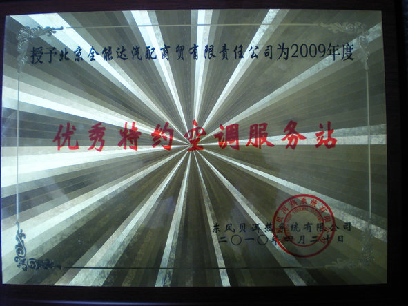 我公司榮獲東風(fēng)貝洱熱系統(tǒng)有限公司2009年度"優(yōu)秀特約空調(diào)服務(wù)站”稱號(hào)。